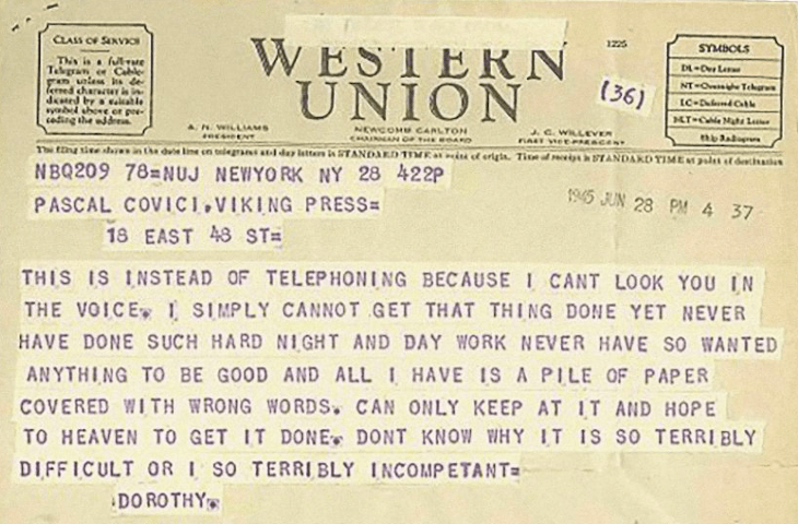 She was also human. In June of 1945, whilst suffering from a bout of writer’s block, she sent this dejected telegram to her editor, Pascal Covici.